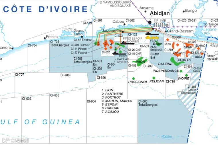 Baleine油田是埃尼集团(Eni)在科特迪瓦的首个开发项目,也是非洲首个净零排放上游项目。该巨型油田于2021年发现,首期于2023年投产,近期启动的第二期(2024年12月)使其产能提升至每天6万桶原油和7000万立方英尺伴生气。