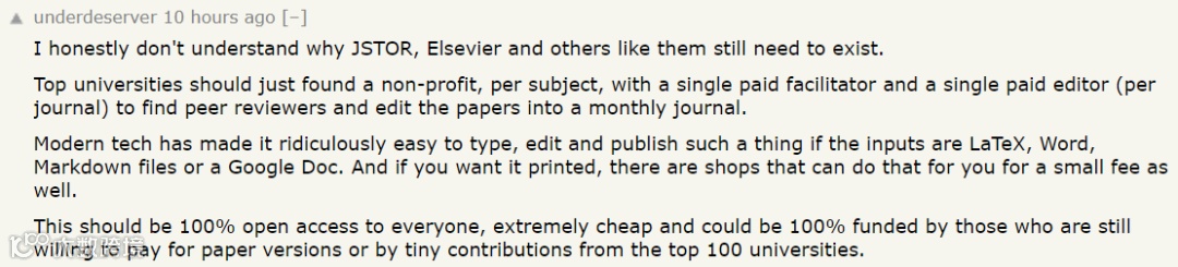 不过也有网友发出「灵魂一问」:实在不理解为什么 JSTOR、爱思唯尔以及其他类似学术出版机构能够长久存在下去。 ta 还提出建议,顶级大学应针对每个学科提供非盈利性出版服务,每个期刊分别设立一名付费服务商和付费编辑,然后聘请同行审稿人,最后将论文编辑成月刊发表。