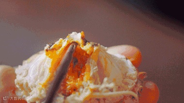 分别取出金黄的蟹黄、洁白的蟹膏、鲜嫩的蟹肉