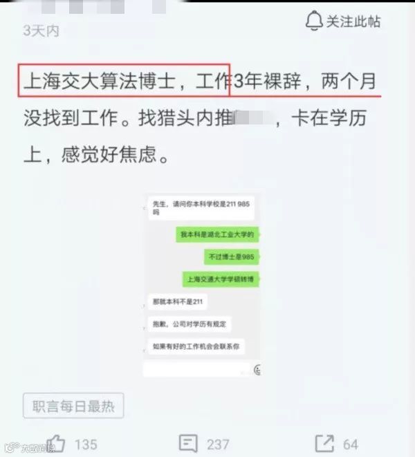 我们曾报道过这样一则新闻。一名交大的学习算法的博士,工作三年后辞职,本以为很快能找到新工作,然而两个月过去,仍然没有找到合适的工作。据称,一名猎头曾联系了这位博士,但在得知其本科就读院校为非211大学时,表示公司对学历有规定,委婉地拒绝了他。