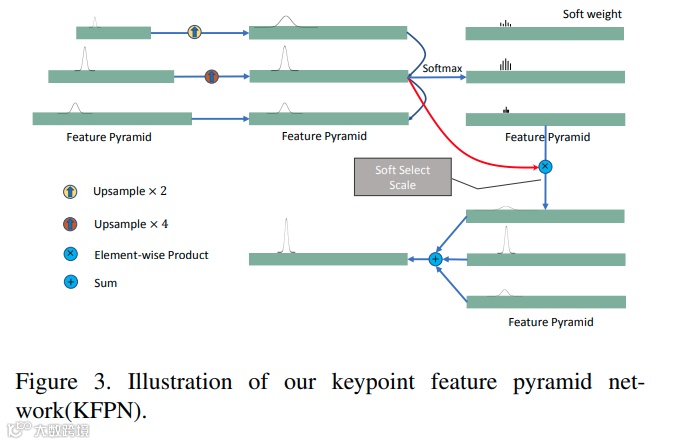 图像中的关键点在大小上没有差异。因此,关键点检测不适合使用特征金字塔网络(FPN)。本文提出了一种新的关键点特征金字塔网络(KFPN),以检测点空间中尺度不变的关键点。假设我们有F个尺度特征图,我们首先调整每个大小f的大小,将其统一为最大的 f 的大小。然后通过 softmax 运算生成软权重,以表示每个尺度的重要性。通过线性加权获得最终的尺度空间得分图: