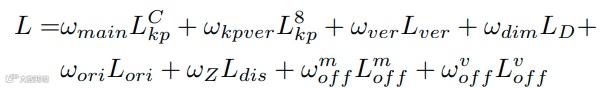 3D 目标的维度 D 方差小容易预测,本文引用基于 Multi-Bin 方法对偏航角 θ 进行回归。将 θ 的余弦偏移和正弦偏移概率在 1 个 bin 中进行分类,并使用 2 个 bin 生成方向特征图,同时对 3D 边框的中心深度Z进行回归。最终的 loss 如下(各部分 loss 的定义参见原文,在此不再赘述):
