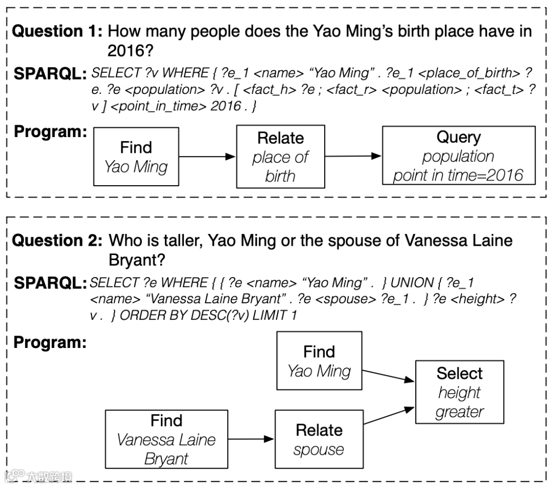 为表示推理过程,KQA Pro引入函数(function)和程序(program)两个概念。函数对应简单问题,程序对应复杂问题,将简单的函数组合成复杂的程序,从而解决复杂问题。具体操作过程可用图三的例子进行简单的说明。