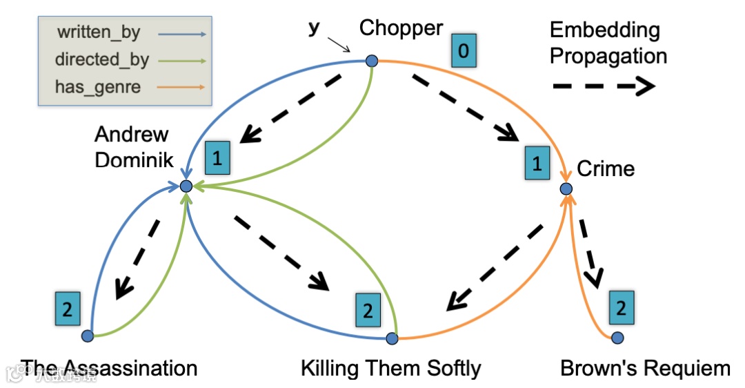 b)知识推理模块:从主题实体出发,找出所有能在 T 跳之内到达的实体(忽略边的方向)及对应的整个子图(图六),用Gy表示。