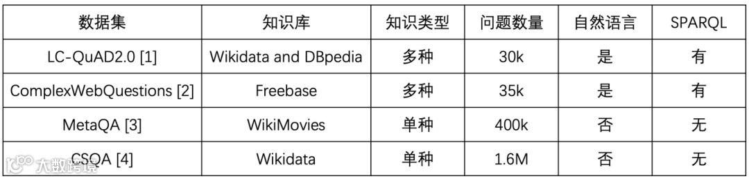 数据集是推理问答的基础,在本次分享中,讲者主要为大家总结了如图一所示的 4 个常用推理问答数据集,并从所用知识库、知识类型、问题数量、自然语言、SPARQL 共 5 个角度加以对比。