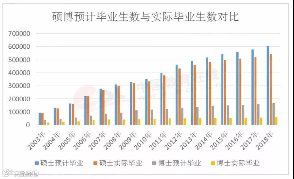 在2018年,硕士实际毕业生数是博士的将近9倍,但博士延期毕业生数超出硕士47939人,达到10.8万人。