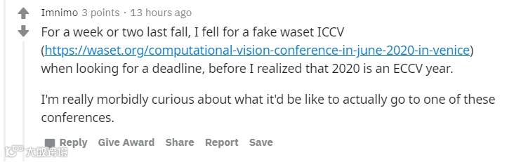 还有网友表示,他之前迷上了一个假的 ICCV,直到了解到 2020年举办的是 ECCV 才回过神来。