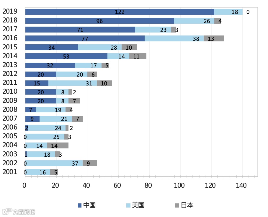 根据“图数据库”领域关键词,从AMiner数据库中搜索2000年至2019年图数据库相关专利在全球范围内的申请情况。