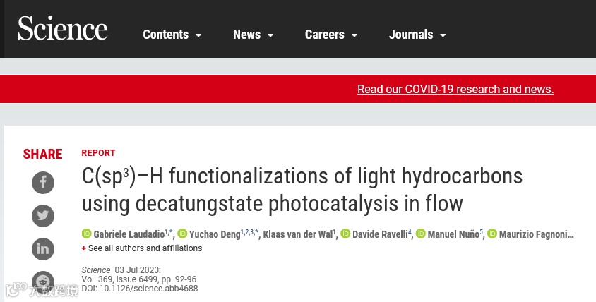 7月3日,上海科技大学物质学院2017级研究生邓宇超以共同第一作者身份,在国际知名学术期刊《科学》(Science)上在线发表了题为“C(sp3)–H functionalizations of light hydrocarbons using decatungstate photocatalysis in flow”的科研成果。这是该校物质学院继今年4月《自然》(Nature)、5月《科学》(Science)之后的又一项顶尖科研进展。