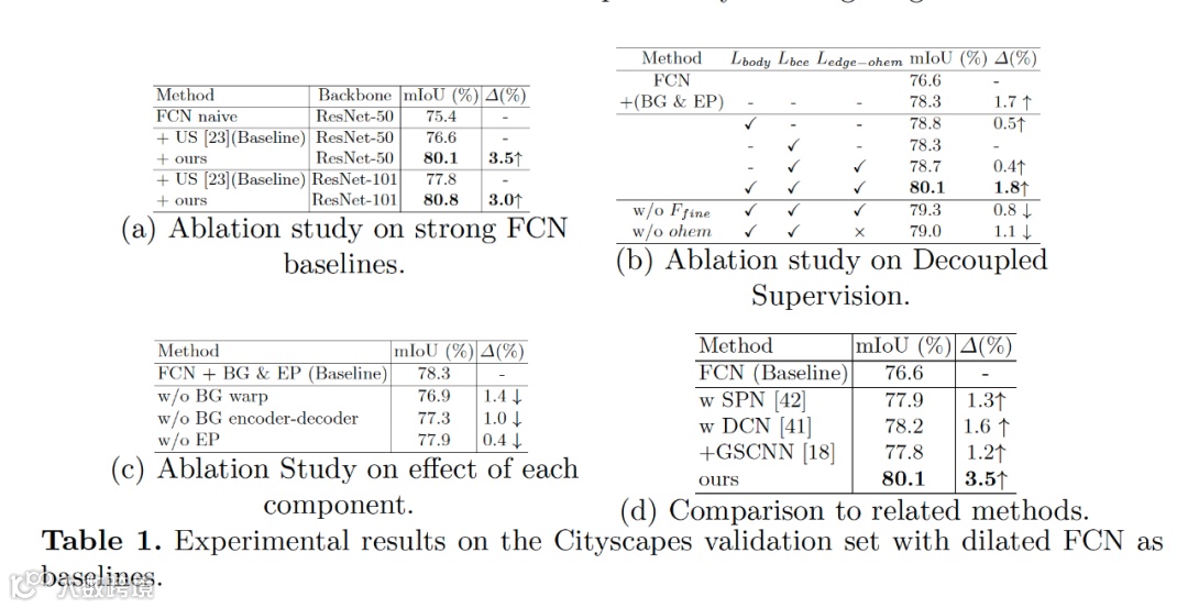 Fig3 中展示了我们分割结果的在边缘的评测指标中也比之前最好的 G-SCNN 的结果要好。Fig5 展示了我们学习到解耦的特征表示,Fig6 给出了学习到的流场的可视化图像,其中可以看到对于 FCN 的结构,流场是指向物体的内部,对于目前的 state-of-the-art 的 deeplabv3+ 模型,流场是均匀地分布在边缘点上,原因是大部分内部区域 deeplabv3+ 已经很一致了。
