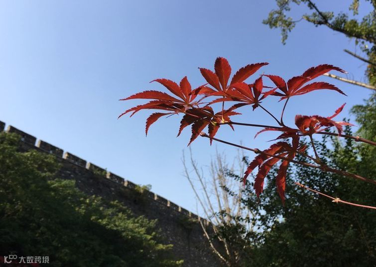 赤红的枫叶和不远处的绿植交织在一起