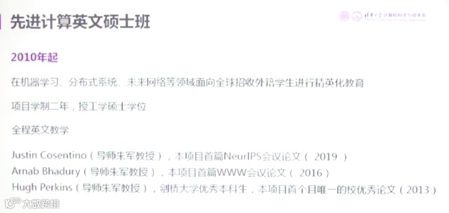 清华还成了一个计算英文硕士班,面向全球招收外籍学生,进行精英化的教育。项目学制是两年,授予工学硕士学位。有三位在朱军教授的指导下取得了很好的成绩。