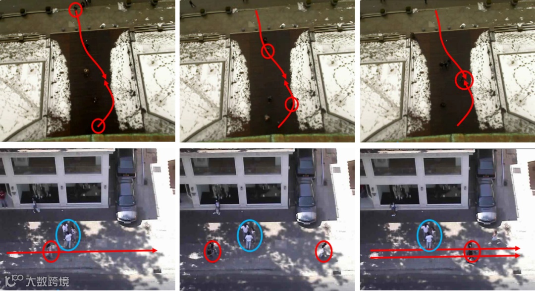 早先的做法,例如 pooling 和 attention,都是基于行人之间的欧式距离来判断交互关系的强弱。这种基于欧氏距离的判断方法,不能很好的处理现实生活中复杂的情况。例如下图中所示,上图两人虽然相隔整个场景,但是表现出了很强的相遇的行为倾向。而下图的三组行人,红色两组虽然距离较远,但是表现出了跟随的行为,而红蓝两组虽然距离较近,但是没有产生很强的相互作用。