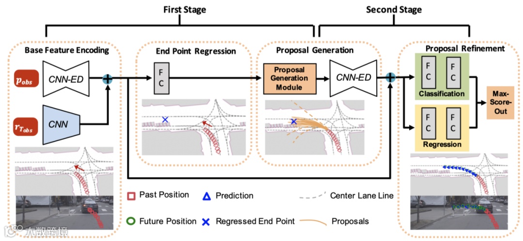 基础特征提取模块结合目标的历史轨迹、环境信息(道路结构),使用基于 CNN Encoder-Decoder 的结构提取特征。并基于该特征对目标未来的终点进行初步预测。