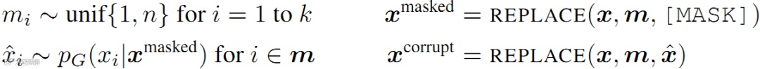 其中 REPLACE 是定义的替换操作。第一个是用 [MASK] 替换,第二个是用生成器生成的字符替换。