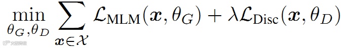 这与 ELECTRA 大致相同,仅有的不同的在判别器的损失仅来自于输入中被遮蔽的 15%tokens。换句话说,$\mathcal{L}_{\mathrm{Disc}}$ 中 $i$ 的不再是 1-n,而是 $i \in m$。