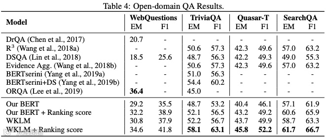 实验结果表明,WKLM 在诸多需要大量高层次知识的任务上,都取得了比传统方法高许多的表现。这也再次证明:判别式目标是值得众多自监督学习和无监督学习研究者们关注的方法,其对高层次抽象特征的学习能力值得我们关注。