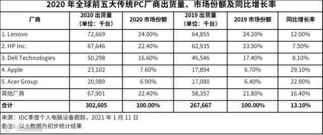 自2012年开始,全球PC出货量连续7年下跌,市场上一直有“PC是夕阳产业、会被手机取代”等言论。2020年,疫情刺激了居家办公、线上学习以及消费需求增长,全球PC出货量同比增长13.1%,创下了自2011年以来最高的增长数据。其中,联想以24%的市场份额位列全球第一,同比增长12%。