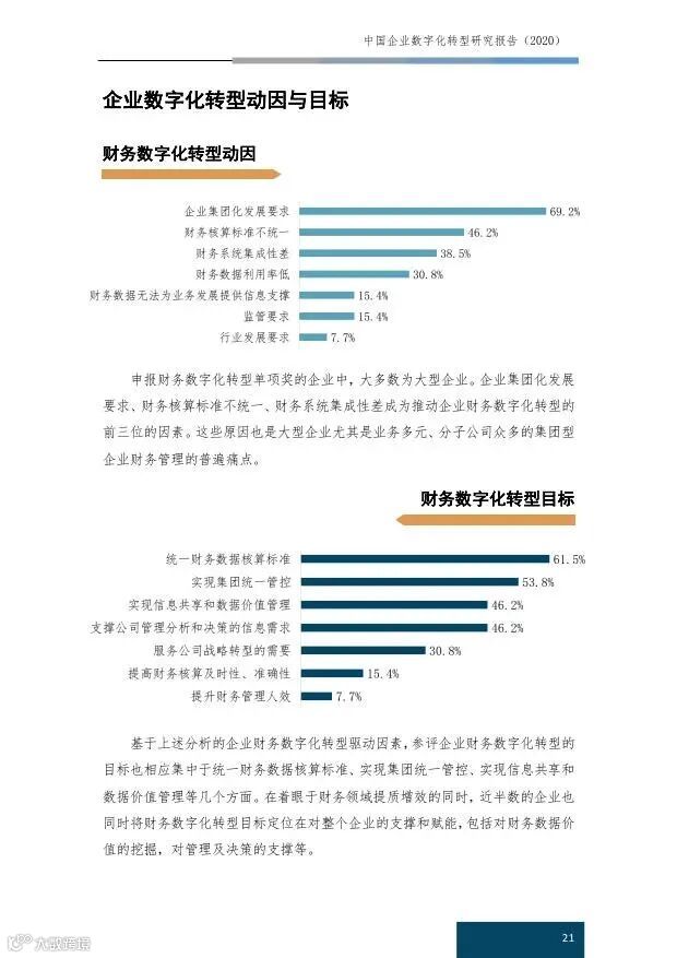 报告中分析了企业做财务、人力、供应链、营销四个领域数字化转型的动因及目标。以财务数字化转型动因和目标为例,申报财务数字化转型单项奖的企业中,大多数为大型企业。企业集团化发展要求、财务核算标准不统一、财务系统集成性差成为推动企业财务数字化转型的前三位的因素。这些原因也是大型企业尤其是业务多元、分子公司众多的集团型企业财务管理的普遍痛点。