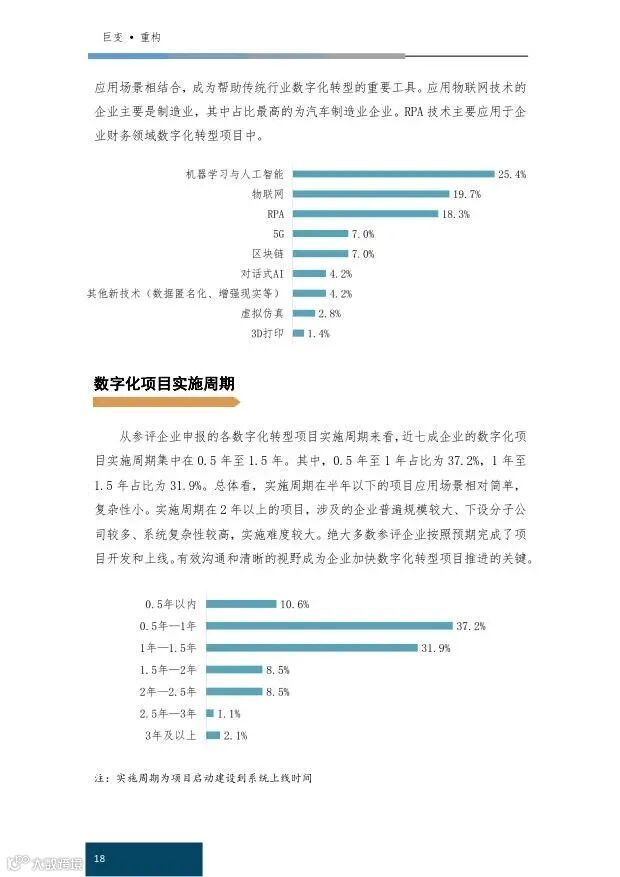 趋势五:人工智能成为数字化转型落地应用最多的新技术。人工智能和机器学习在众多行业中找到落地场景,而IoT、RPA等新技术也在财务、生产制造和供应链管理数字化转型等方面得到更广泛的应用。