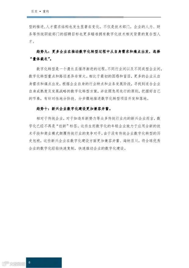 趋势十:新兴企业数字化建设更加兼容并蓄。生而数字化的年轻企业致力于应用全新的技术手段和商业模式颠覆传统行业的竞争对手。快速复制全球优秀企业的数字化经验,推动企业的数字化建设。