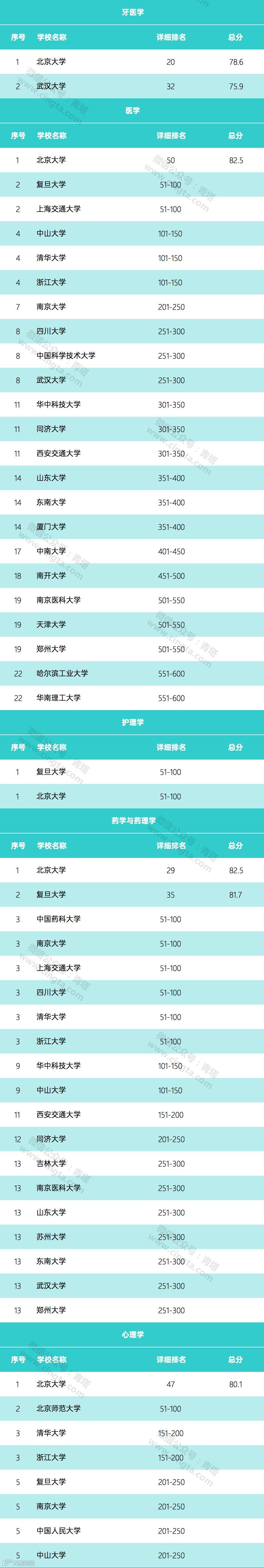 世界前50名的学科,18所中国内地高校的100个学科进入世界50强。其中,北京大学32个,清华大学22个,上海交通大学12个,复旦大学11个,浙江大学4个,武汉大学和同济大学各3个,南京大学、中国科学技术大学各2个,北京师范大学、中国农业大学、华南农业大学、南京农业大学、中国人民大学、中国矿业大学、中央美术学院、中央戏剧学院、西安交通大学各1个。