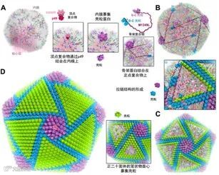 中国科学院生物物理研究所饶子和王祥喜团队和中国农业科学院哈尔滨兽医研究所步志高团队联合上海科技大学等单位,在上海科技大学冷冻电镜中心连续收集了高质量数据,采用一种优化的图像重构策略,解析了非洲猪瘟病毒衣壳的三维结构,其分辨率达到4.1埃。该衣壳颗粒体型巨大且结构复杂,由17,280个蛋白亚基组成,其中包括1种主要(p72)和4种次级衣壳蛋白(M1249L、p17、p49和H240R),它们组装成五重对称体和三重对称体的复合结构。主要衣壳蛋白p72原子分辨率结构展示出非洲猪瘟病毒潜在的构象型抗原表位,与其他的核胞质大DNA病毒(NCLDV)显著不同。次级衣壳蛋白在衣壳内表面形成了一个复杂的蛋白相互作用网络,通过调控相邻的病毒壳微体之间的作用力介导衣壳的组装并稳定了衣壳的结构。作为核心的组织者,100纳米长的M1249L蛋白沿着三重对称体的每个边缘桥接了两个相邻的五重对称体,与其他衣壳蛋白形成了延伸的分子间网络,驱动了衣壳框架的形成。这些结构细节揭示了衣壳稳定性和组装的分子基础,对非洲猪瘟疫苗的研发具有十分重要的理论指导意义。