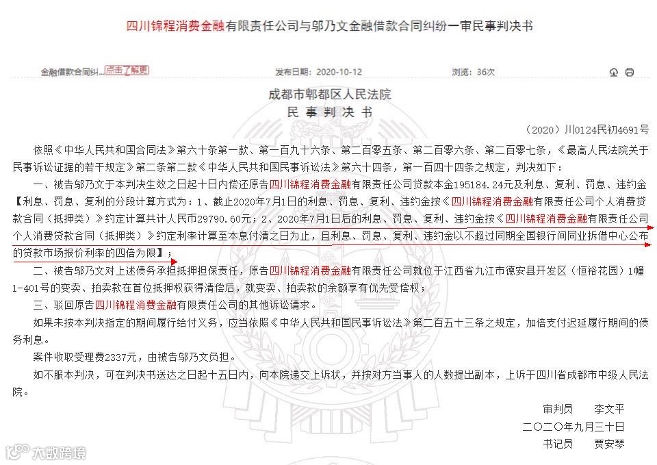 近日,成都市郫都区法院发布了多则四川锦程消费金融与个人金融借款合同纠纷判决书,其中均提及利息、罚息、复利、违约金以不超过同期全国银行间同业拆借中心公布的贷款市场报价利率的四倍为限。