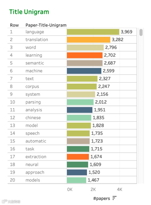 最常出现的术语是machine translation,毫无疑问,机器翻译是NLP领域最受关注的研究领域之一。