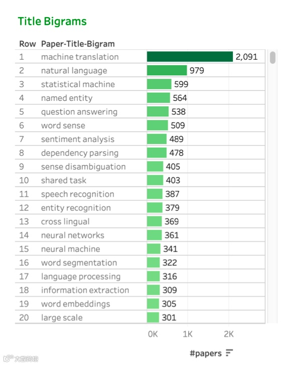 从术语分布来看,NLP论文标题中最常用的术语是language,其次是translation。如果考虑bigram的话,如下图: