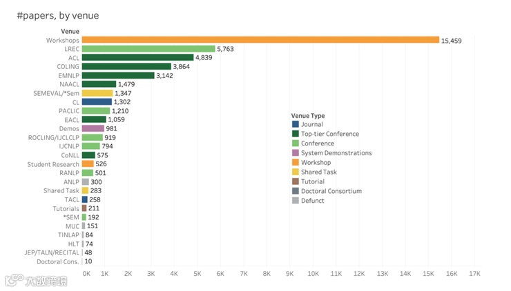 从中可以看出,除了各种workshop论文外,LREC已经成为NLP会议论文的最大单一来源(尽管LREC是一个相对较新的会议,每两年召开一次,但它的接受率往往很高,约60%)。其次则是主会ACL/4839,COLING/3142,NAACL/1479……