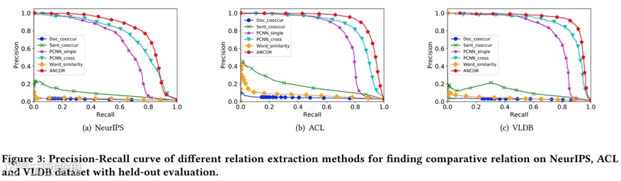 论文采用了NeurIPS/ACL/VLDB共12k篇论文。使用其中80%作为训练数据,20%作为测试数据。使用co-occurrence、词相似度等方法作为Baseline算法进行比较评估。由于生成的数据中,负例数量较多,所以无监督学习算法整体的准确率都较差。
