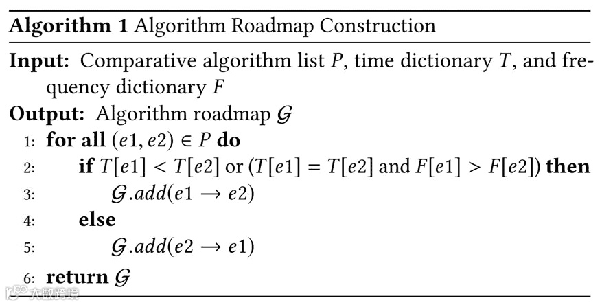 在路线图的生成方面,由于先前生成的关系并无方向信息,在这里,作者使用算法出现的第一篇论文的时间作为算法的诞生时间,根据时间先后给定关系方向。如果年份相同,则按照出现频率大小给定方向。