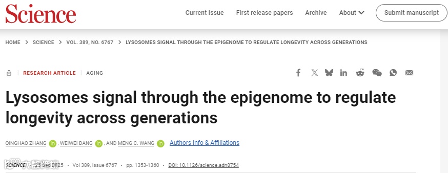 Zhang Q, Dang W, Wang MC. Lysosomes signal through the epigenome to regulate longevity across generations. Science. 2025 Sep 25;389(6767):1353-1360. doi: 10.1126/science.adn8754.