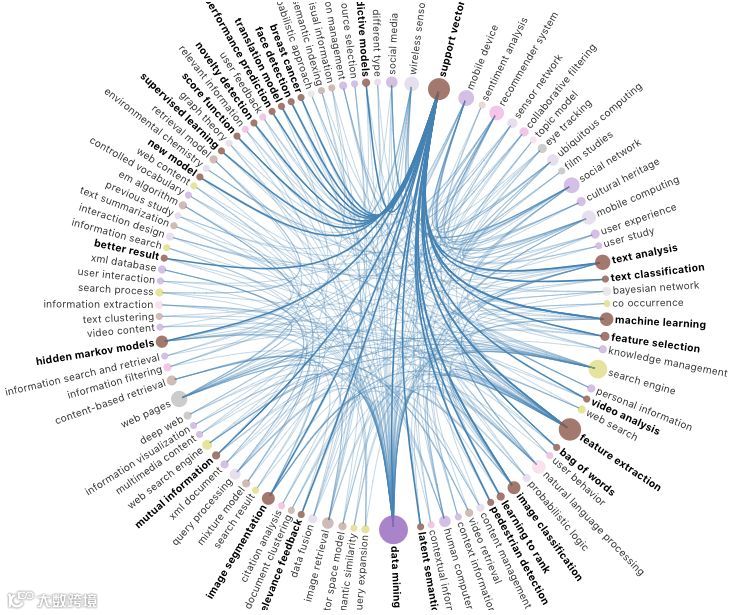 技术预见图中点的大小表示该技术的热点(主要由相关论文数量的多少决定,相关论文越多,热度越高,点越大),各技术之间的连线表示2个技术关键词同时在N篇论文中出现过(当前N的取值为5)。