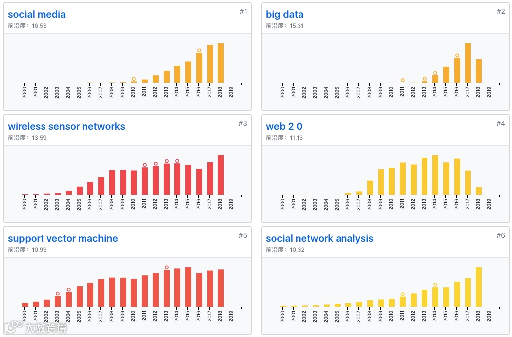 Retrieval System(检索系统)和Information System(信息系统)是兴起时间较早,前者出现在1970-1979和1980-1989年间;后者出现在1980-1989和1990-1999年间;而Data Mining(数据挖掘)和Search Engine(搜索引擎)是近年来兴起的,出现在2000-2009和2010-2019年间,并且关于它们的研究热度不减。