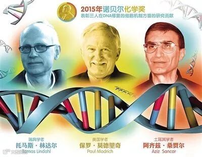2015年诺贝尔化学奖授予了美国科学家保罗·莫德里奇(Paul Modrich)、瑞典医学家托马斯·林达尔(TomasRobertLindahl)与美国和土耳其国籍生物学家阿齐兹·桑贾尔(Aziz Sancar),获奖理由是“DNA修复的细胞机制研究”。