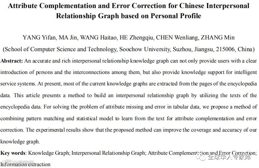 剖析:本文描述了从百科类数据描述构建人物关系图谱的过程,作者对人物属性和关系进行归一化处理,为提高图谱的覆盖率和正确率,从文本中进行自动学习知识进行纠错和补全。最终获得了包含百万级人物实体和千万级三元组的人物关系图谱。该论文采用模式匹配和统计模型相结合的策略从文档数据中自动学习补全和纠错属性,提高了知识图谱的正确率和覆盖率。