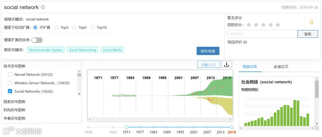 新版在基于领域关键词进行趋势分析的基础上,新增了基于国家、机构、学者的趋势分析,用户可更全面地了解该领域的横纵面信息。