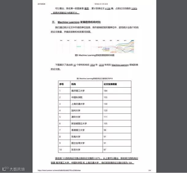 点击趋势图右上角的“下载”按钮后,用户可获得一份PDF版的完整趋势分析报告,内容包括发展整体趋势、发展趋势各国情况对比、发展趋势机构对比等,并附有各国、机构论文数量TOP10排名数据,及详细的图表、分析。