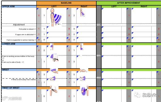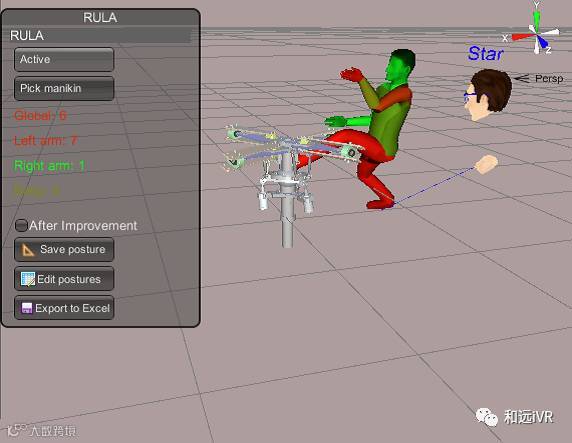 左下图是在VR模式里面进行相关操作,右下图是在桌面模式(桌面模式需要在选项Manikin下面激活相关功能。人体显示绿色是健康姿势的,红色部分是对人体健康不利的。相关数据可以导出Excel)