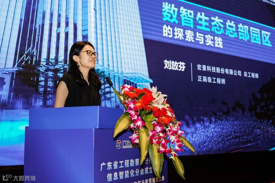 随后的学术报告会,大会邀请了行业专家和代表企业作学术报告汇报和技术成果宣讲。宏景科技刘放芬总工程师作《数智生态总部园区的探索与实践》主题分享。她从总部园区的机遇与挑战、塑造总部园区核心能力、未来发展方向三个方面介绍了宏景科技对建设总部园区的规划与方向。