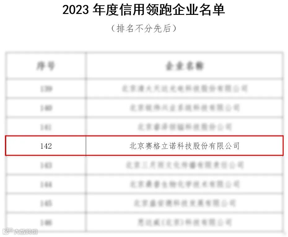 近日,2023年度北京市企业创新信用领跑行动入围企业名单正式公示,赛格立诺凭借多年的守信和在数字化领域的持续耕耘与创新成果,成功获评2023年度“信用领跑企业”,赛格立诺已连续三年入选该榜单。