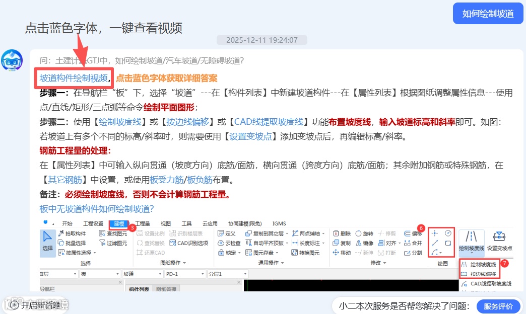 使用【绘制坡度线】或【按边线偏移】或【CAD线提取坡度线】布置坡度线,输入坡道标高和斜率。