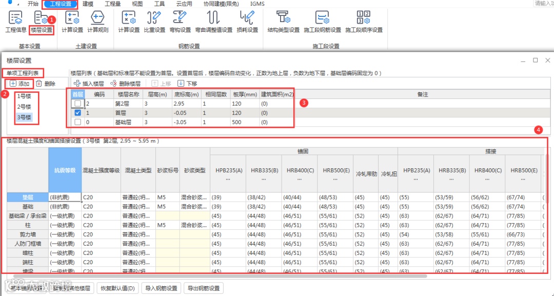 根据实际工程切换对应的单项工程修改对应的楼层/锚固/搭接等信息。