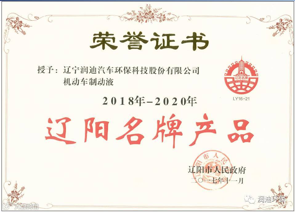 2017年12月7日,辽阳市质量技术监督局为“润迪机动车制动液”颁发“辽阳名牌产品”荣誉证书!既代表了政府机关对我公司的高度赞扬,也是广大用户对我公司产品的认可。接下来,我公司将继续推进质量文化建设,真扎实干,以行动代替口号,做出一流品质的产品,让用户满意,让消费者放心。