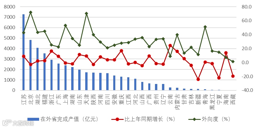 2024年上半年各地在外省完成的建筑业总产值、增速及外向度