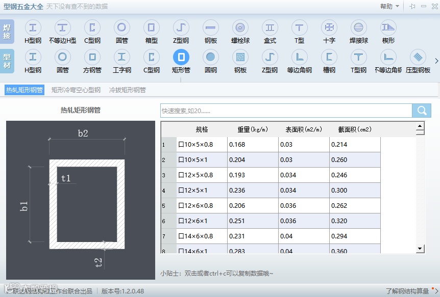 使用方法:按类型选择不同规格搜索,即可看到对应规格重量、表面积、截面积等结果