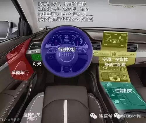 比如,行驶时最常用、厂家最希望你用到的,肯定能在方向盘附近找到;灯光一般在中控台左边,空调和多媒体在中控台正中,和性能、行驶相关的一般放在档把附近;车窗车门反光镜相关的都在门上;座椅控制通常在座椅侧面。当然上面都是常见车型,特例我们也会尽量列举。