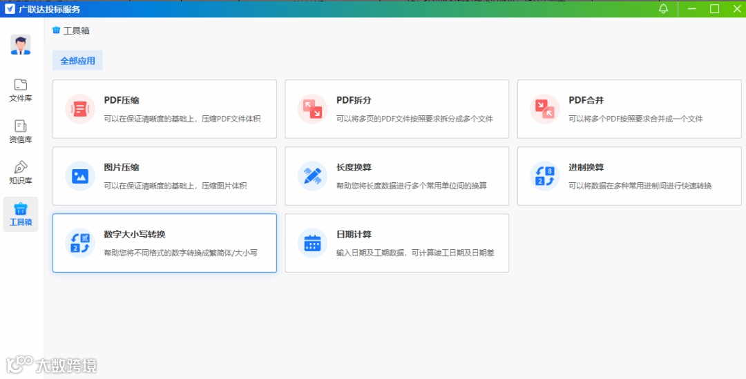 【呈现效果】下载安装广联达投标服务产品,通过工具箱中提供的PDF的功能操作,可以快速进行文件处理,辅助投标市场主体高效进行投标交易活动。